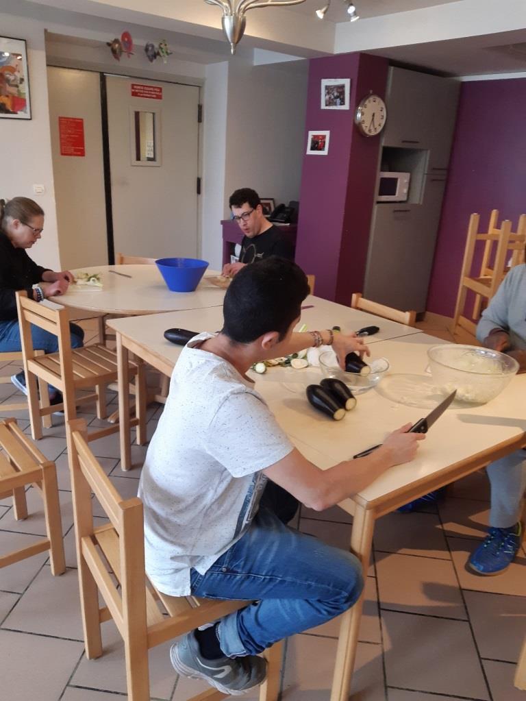 Cet après-midi épluchage des légumes en vue d’une soupe maison par Mehdi, Sarah, Yazid et Alexis.