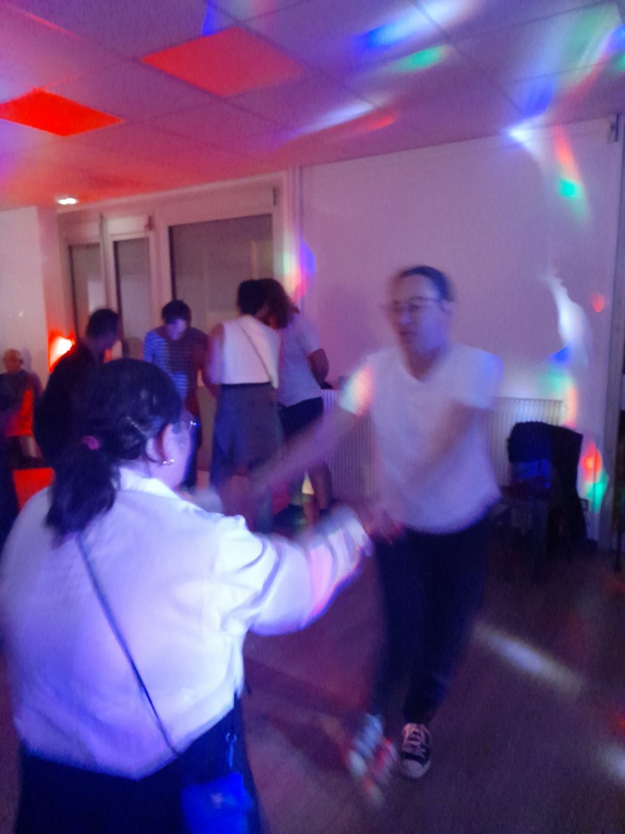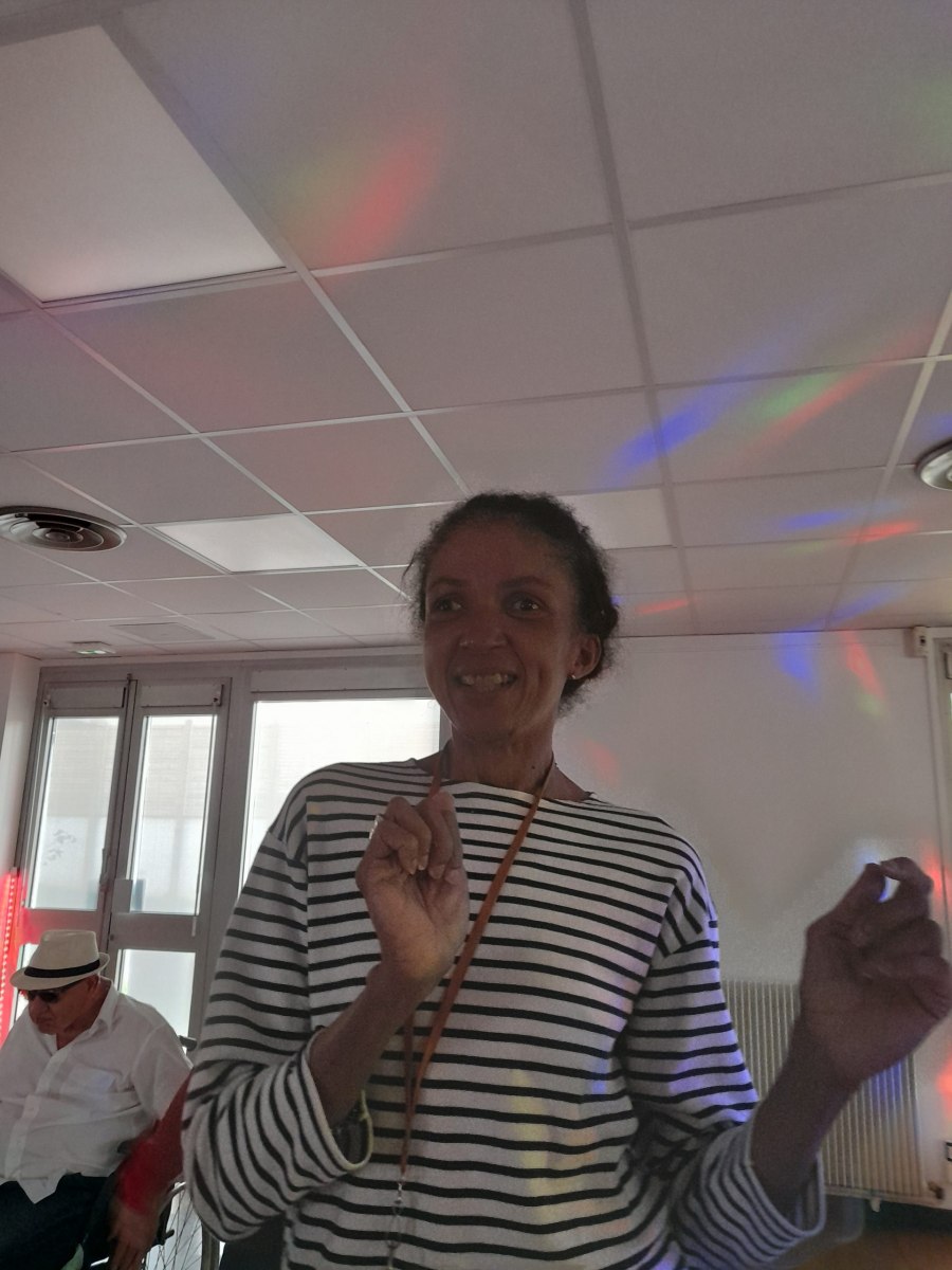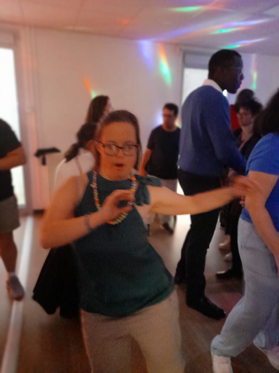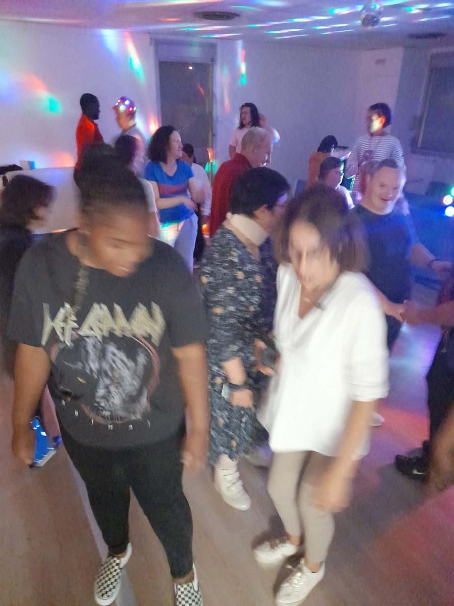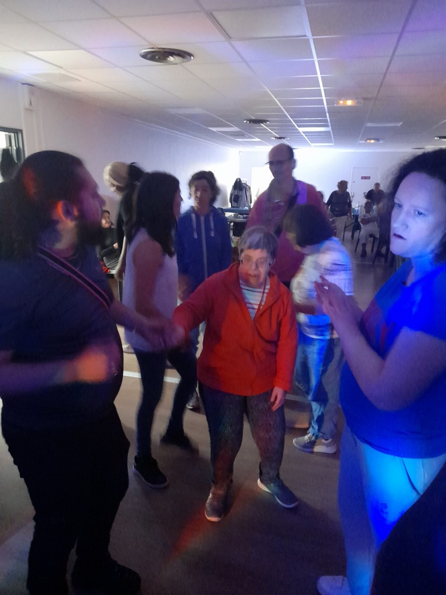 Samedi 7 octobre dès le milieu d’après-midi, la salle de restaurant du complexe Renée Le Duc était transformée en discothèque. Nous étions une centaine (résidents de l’APEI mais aussi d’autres Foyers, de travailleurs d’ESAT, des alentours) à vibrer sur la musique de nos DJ Maximilien et Adrien.
