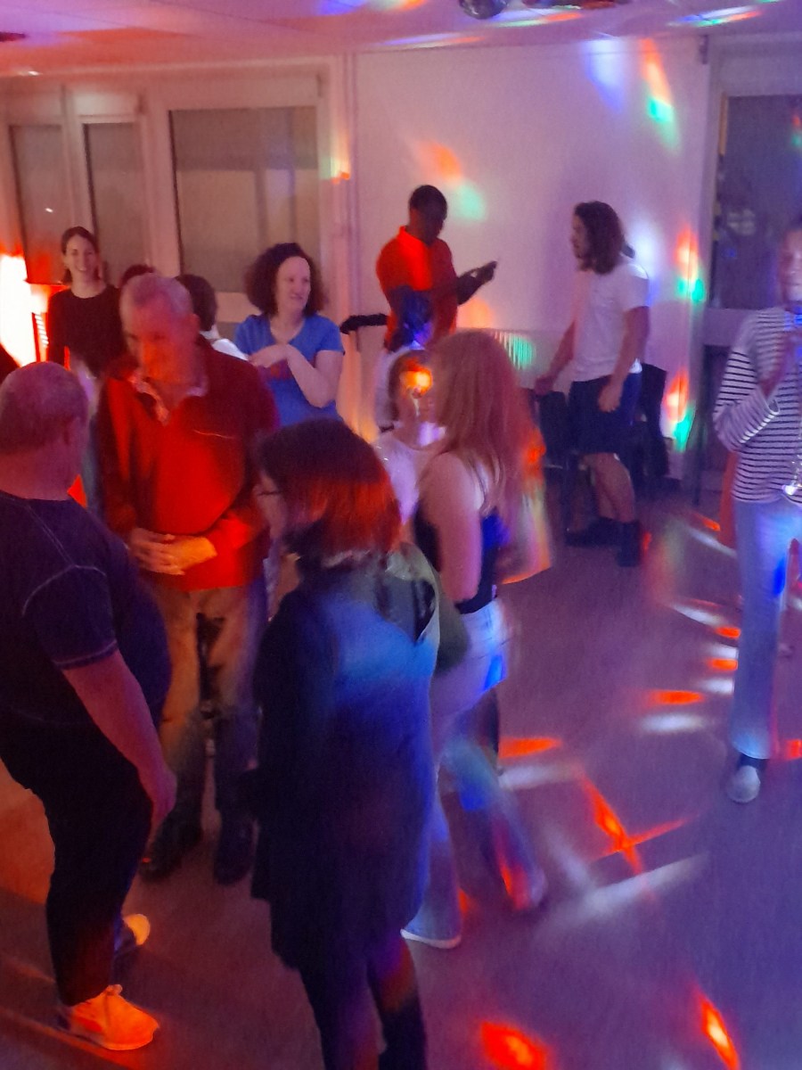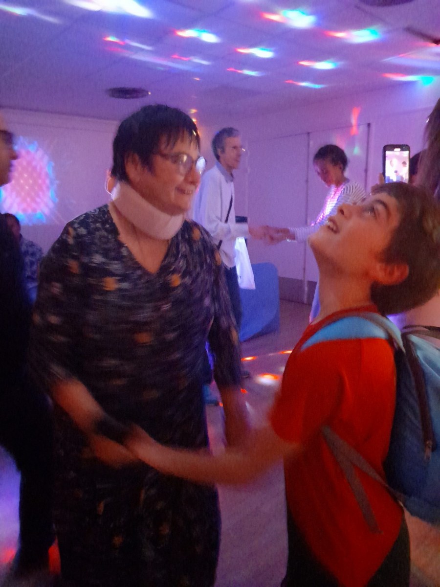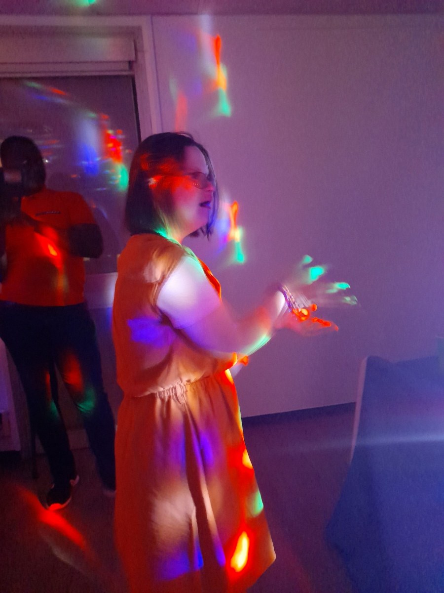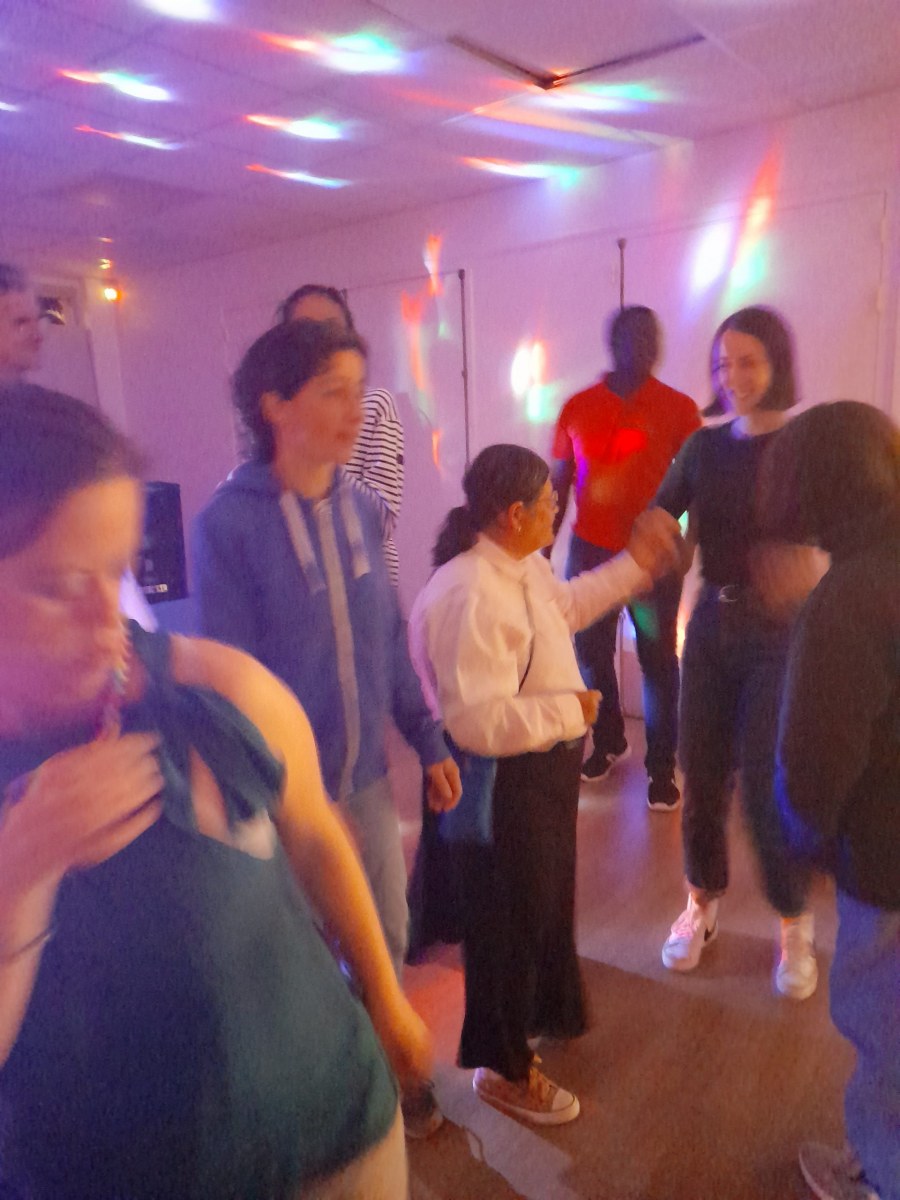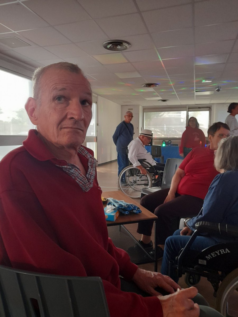 Samedi 7 octobre dès le milieu d’après-midi, la salle de restaurant du complexe Renée Le Duc était transformée en discothèque. Nous étions une centaine (résidents de l’APEI mais aussi d’autres Foyers, de travailleurs d’ESAT, des alentours) à vibrer sur la musique de nos DJ Maximilien et Adrien.